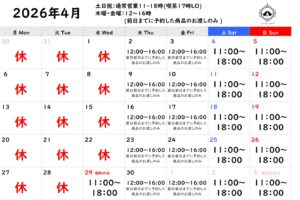 4月の営業日 投稿者: inoue2026年4月1日2026年4月4日お知らせ 【お客様へのお願い】 ①カフェご利用の際は、小学生以上の方はお1人様につき1ドリンクのご注文をお願いいたします。また最初にレジにてご注文・お会計をお願いしています。 ②カフェは1時間制(パフェは1時間半、アフタヌーンティーは2時間)とさせていただいています。 ③駐車場スペースに限りがあるため、お車のご利用は「1組様1台まで」でお願いいたします。 * * * * * ・土日祝日11:00-18:00通常営業 (喫茶17:00ラストオーダー) ・木曜・金曜12:00-16:00 一部営業 前日12:00迄に予約・支払いまで完了したお菓子・珈琲豆のお渡しのみです よろしくお願いいたします。 シェアする